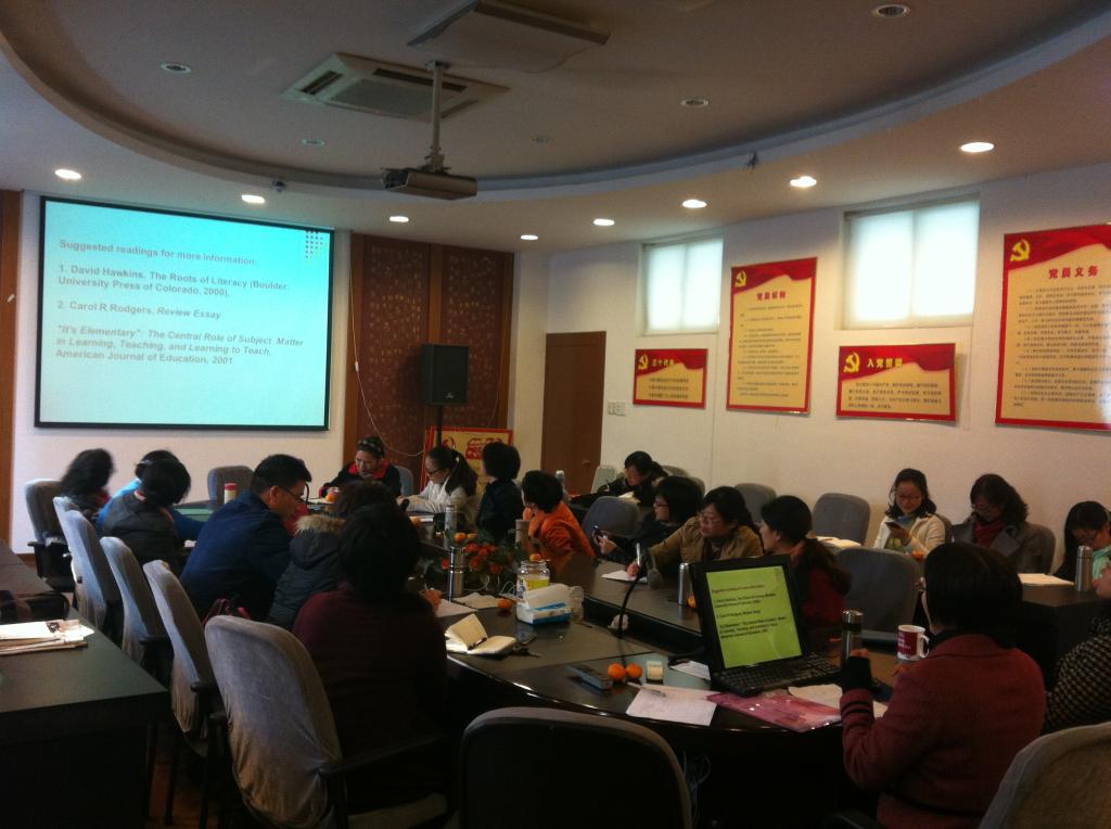 刘兰萍老师以三角形三个顶点分别代表教学过程中三个元素“I”、“Thou”、“It”,向与会教师介绍了目前流行的教学方法。结合语言教学特点和自身教学经验,诠释如何在教学过程中确立教学使命,明确教学目标,转变教学角色,创新教学方法。讲授课件图文并茂,内容丰富多彩,讲解过程轻松流畅。与会教师认真聆听,积极互动,感受颇多,受益匪浅。
