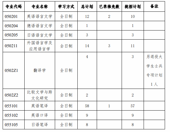 050204德语语言文学、0502Z2比较文学与跨文化研究、0502Z1翻译学、055105日语笔译专业一志愿按实际上线考生进行复试。
