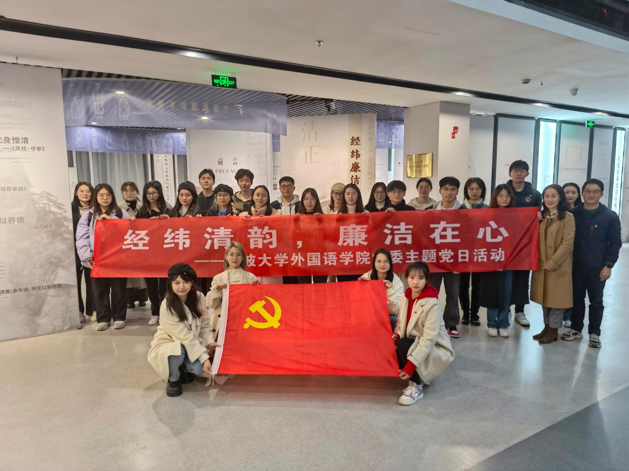党委、纪委举办了以“经纬清韵 廉洁在心”为主题的党日活动。学院党委副书记、纪委书记胡佳带领全体学生党支部书记、辅导员、部分党务工作骨干和研究生会骨干一同前往宁波市廉洁文化教育基地——浙江纺织服装职业技术学院“经纬廉洁文化馆”参观学习。