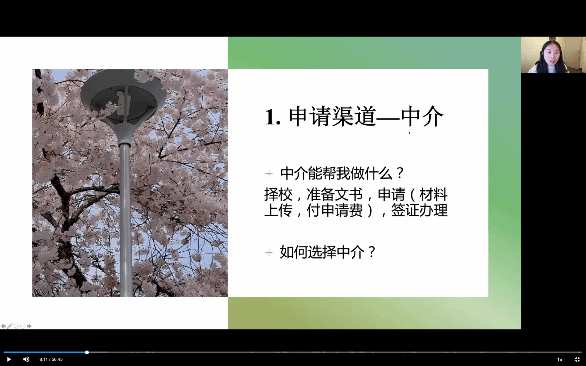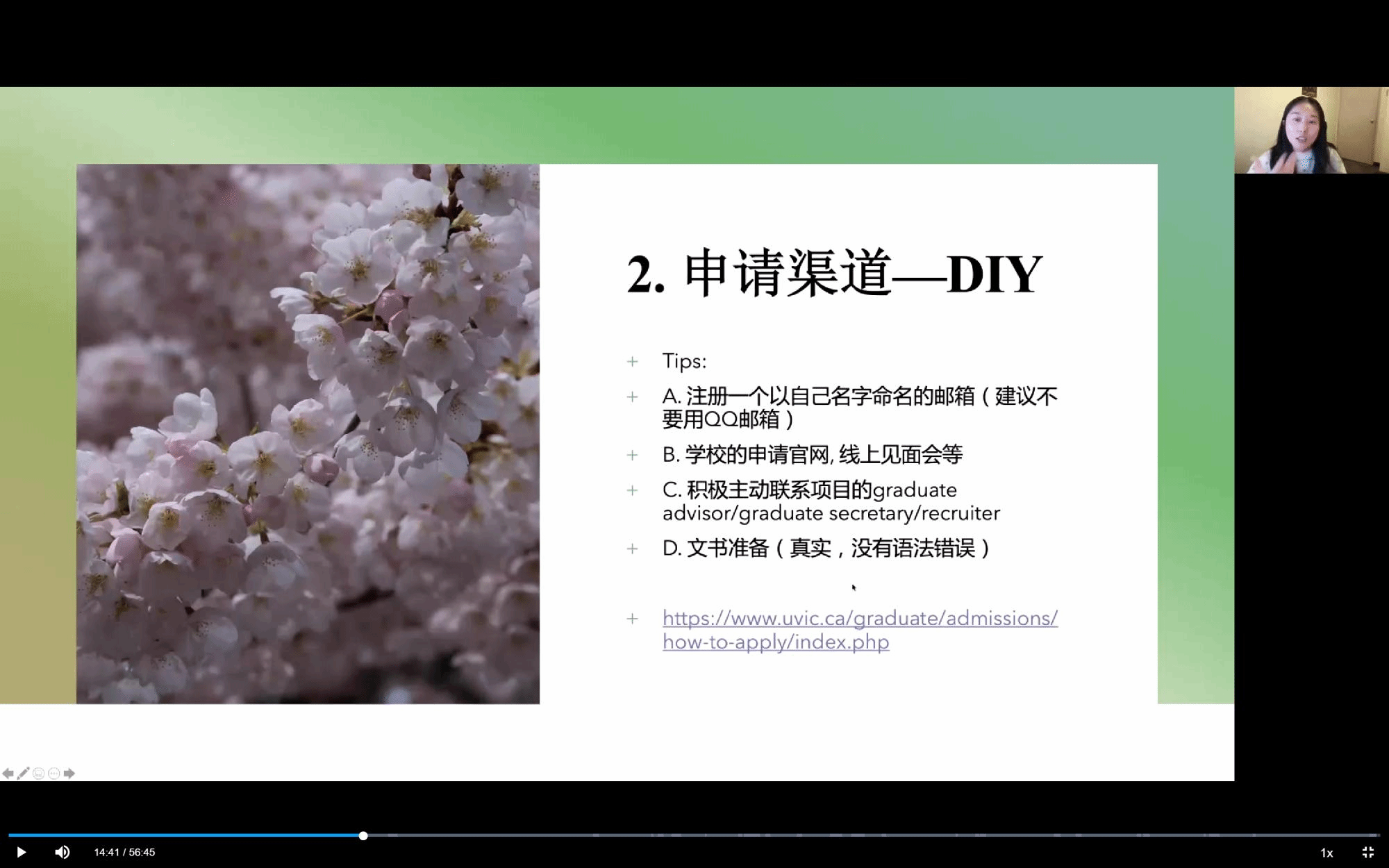 关于申请的渠道,俞学姐分享了自己求助留学中介机构和自主申请的经历,提醒同学们在选择中介时的注意事项,同时鼓励同学们多尝试自主申请这个渠道,并以加拿大维多利亚大学的留学项目申请为例,向大家演示了学校官网申请的大致流程。
