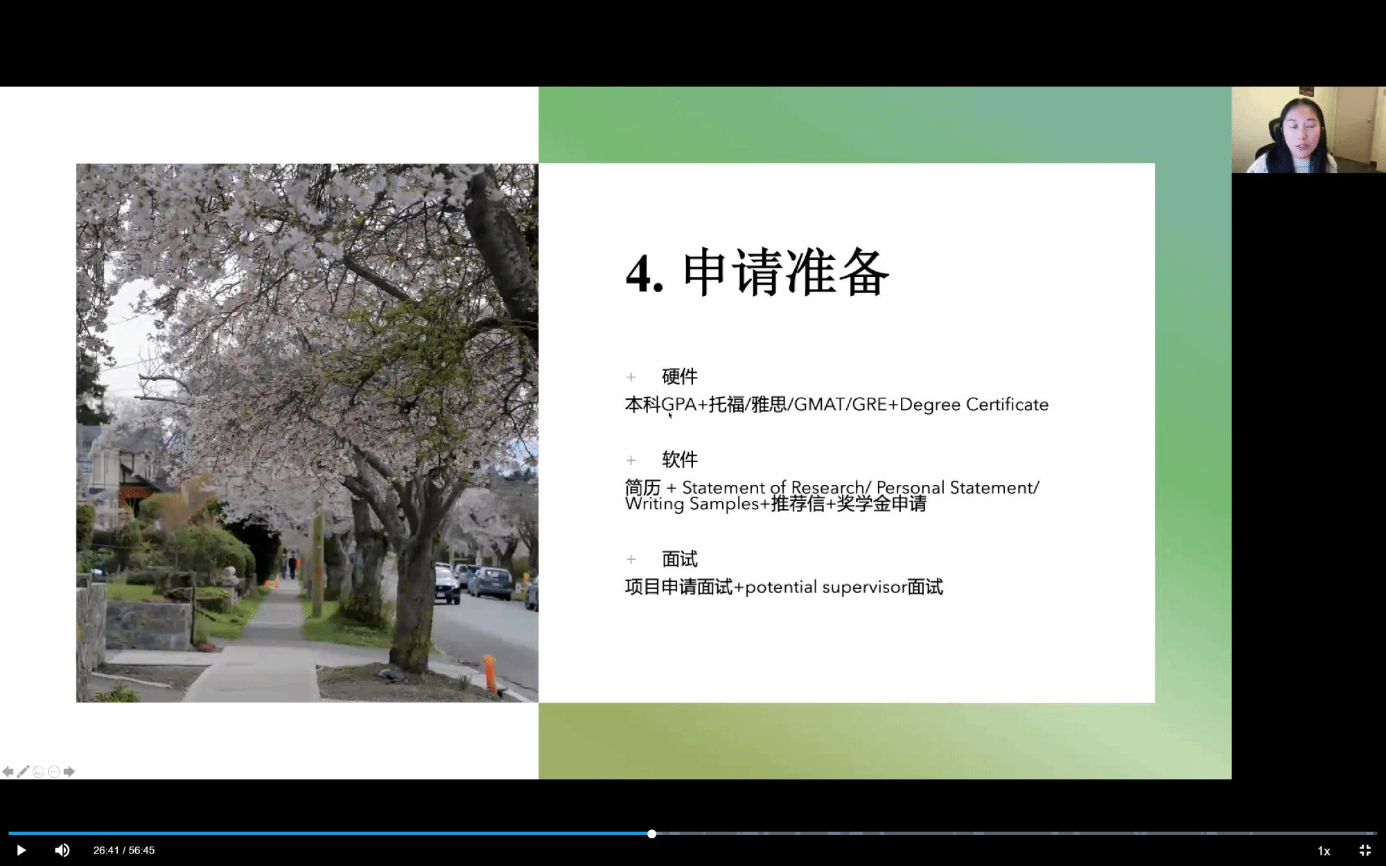 接着俞学姐谈及申请的准备工作,涉及本科的GPA、雅思托福等语言证书、简历、推荐信。