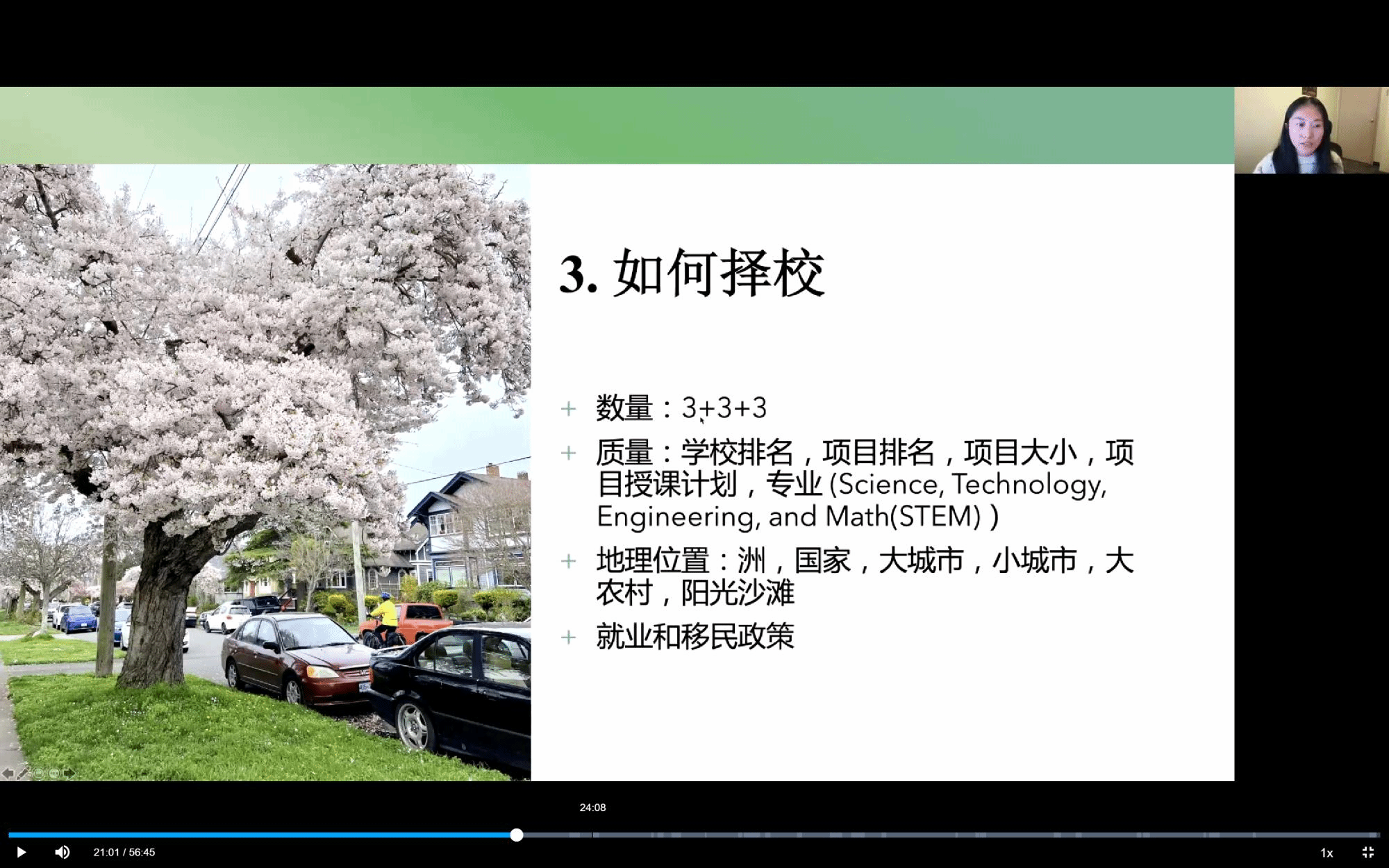 就择校问题,俞学姐认为可以从学校排名、项目规模、项目授课计划、专业实力、地理位置、就业以及移民政策等角度进行考量。