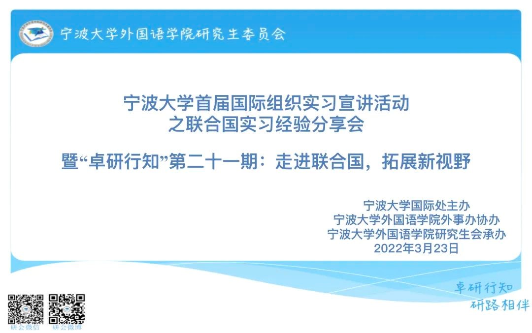 首届国际组织实习宣讲活动之联合国实习经验分享会暨“卓研行知”第二十一期:走进联合国,拓展新视野顺利举办。本活动线上线下双联动,线下在李达三外语楼422会议室举行,线上使用腾讯会议同步直播。本期特别邀请啪啪啦