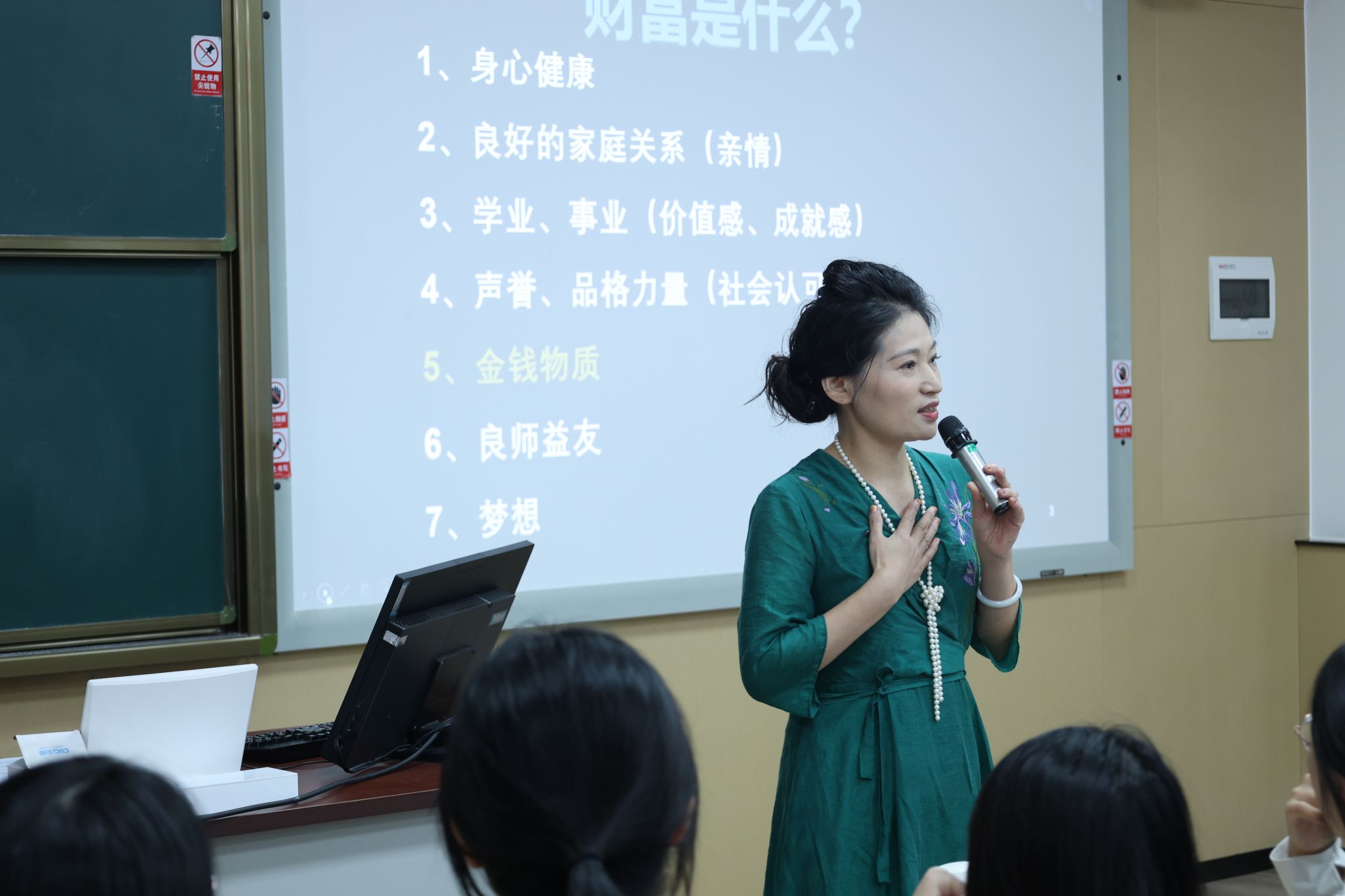 1996级英语专业校友、家业关系赋能专家、关系心学开创人、国家二级心理咨询师组织、家庭系统排列导师、NGH催眠培训导师、坤森心智学院创办人、加拿大曼尼托巴大学Asper商学院访问学者、MBA管理硕士庄雪芬应邀主讲“财富与你的距离”专题讲座。啪啪啦