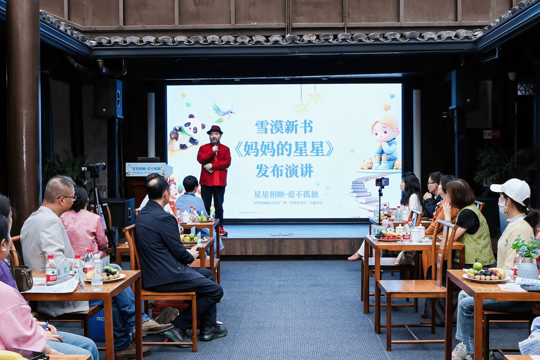 活动主办方代表在开幕致辞中详细介绍了活动的背景与意义,并表达了对所有参与者的热烈欢迎与衷心感谢。随后,甘肃省作家协会副主席、国家一级作家雪漠老师就新书《妈妈的星星》发布演讲。他深情分享了创作背后的感人故事,讲述了文学如何成为连接孤独症儿童与世界的桥梁。雪漠老师还亲自为每户孤独症儿童家庭签名赠书,传递着爱与希望的光芒。