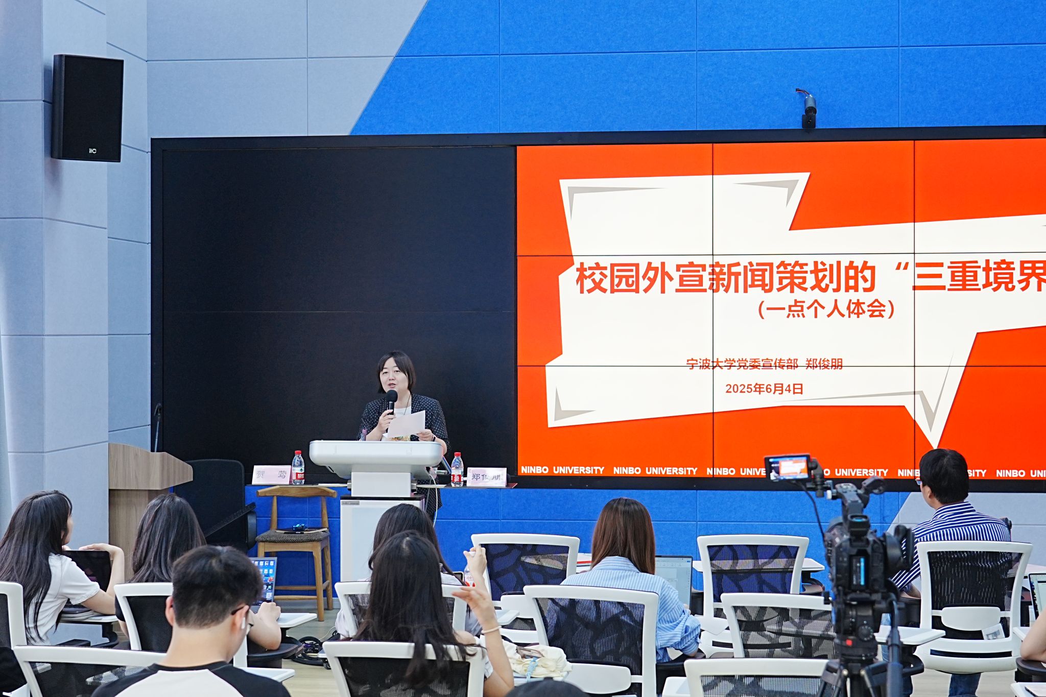 党委宣传部郑俊朋老师,为师生带来了一场题为“校园外宣新闻策划的‘三重境界’”的专题讲座,围绕新闻的“挖掘”“策划”与“呈现”,系统分享了高校新闻宣传的宝贵经验与实务方法。讲座由贺莺教授主持。