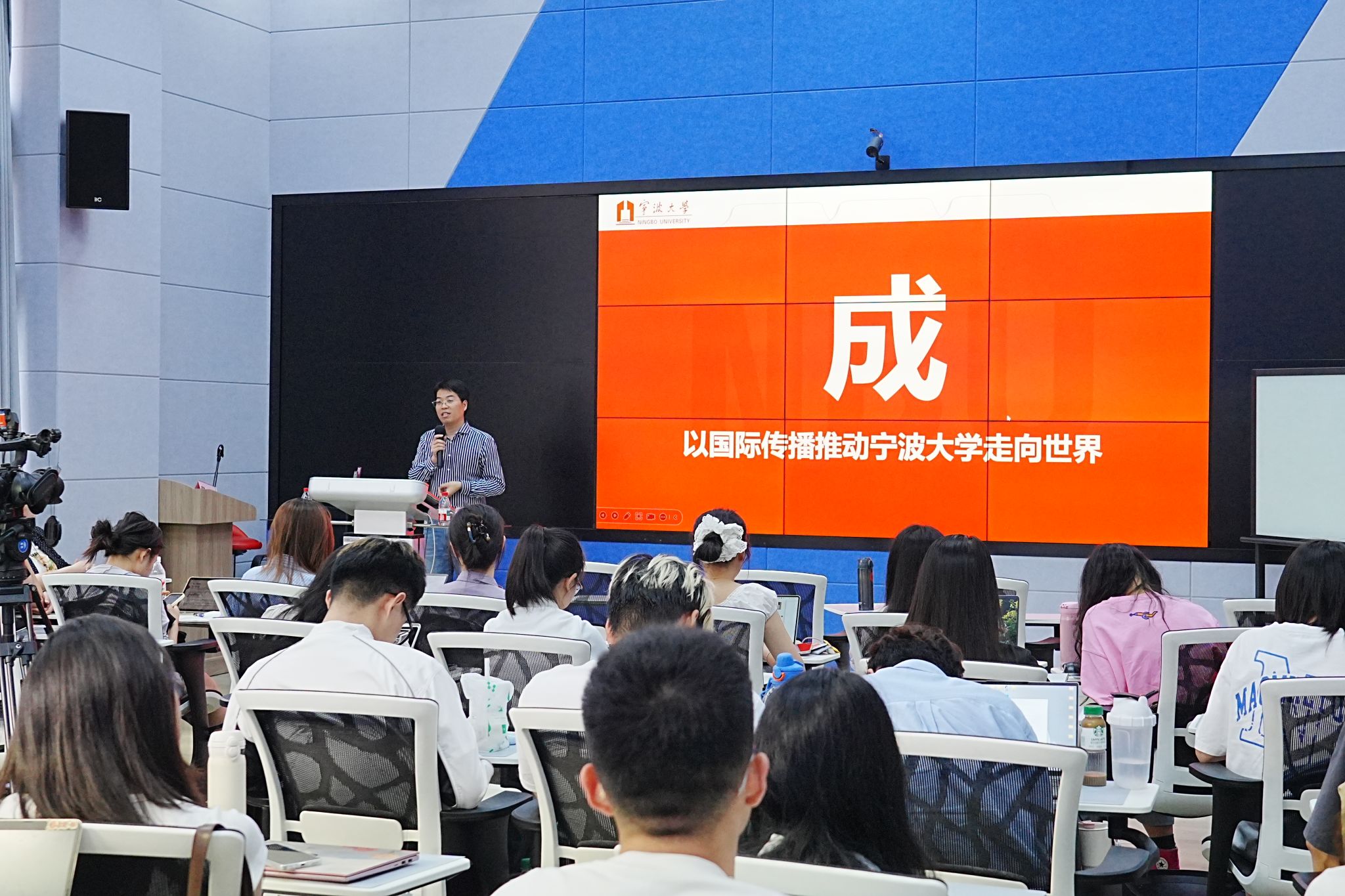 最后,郑老师特别提到,学校当前正在积极推进国际传播基地建设,已与环球网、宁波晚报、宁波电视台等多家媒体建立深度融合合作机制,为内容创作与传播提供了坚实平台与丰富资源。他鼓励同学们立足时代前沿,主动参与创作实践,运用多语种讲好宁大故事,积极推动啪啪啦