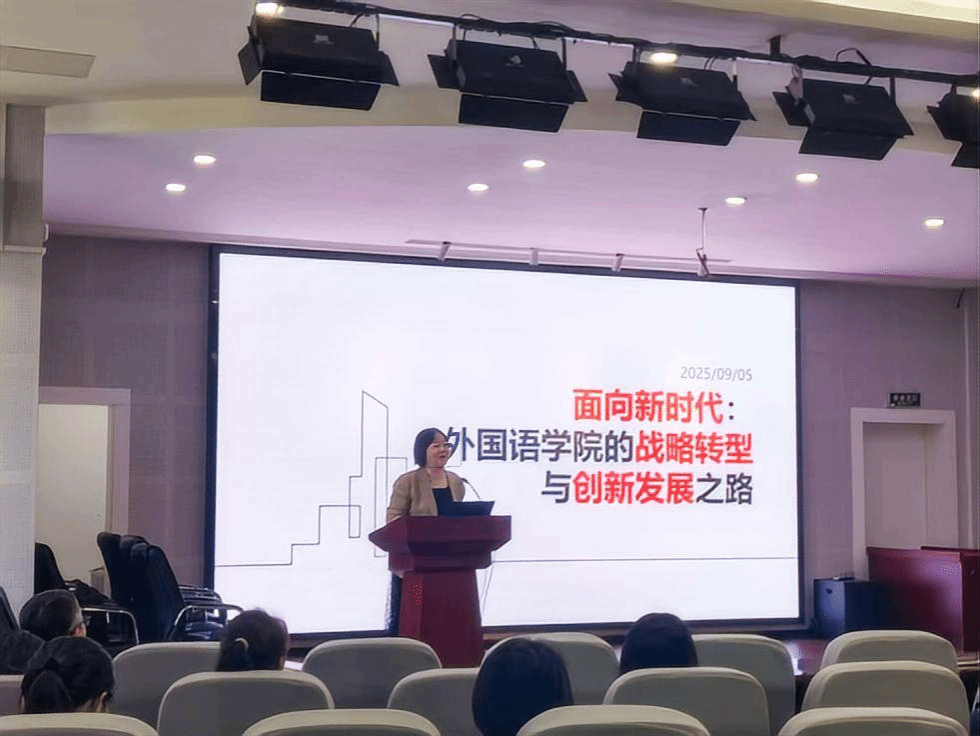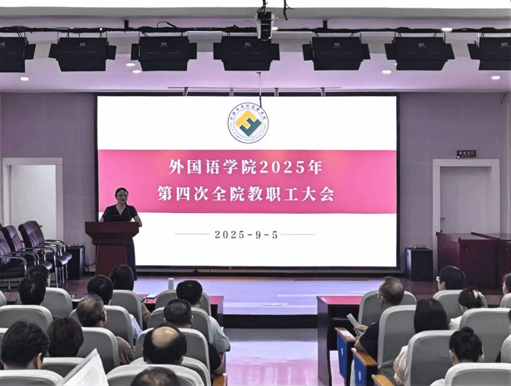 现有的优势与存在的短板。她指出,学院在师资力量、教学资源等方面具备独特优势,但在新形势下也面临新的挑战。她号召全体教职工要“解放思想、大刀阔斧、真抓实干”,打破传统壁垒,缩短调整周期,深化产教融合,破解“传统”难题,推动外语与人工智能、国际政治、经济法律、文化艺术等领域开展交叉创新,勇敢迎接时代之变,共同谱写啪啪啦