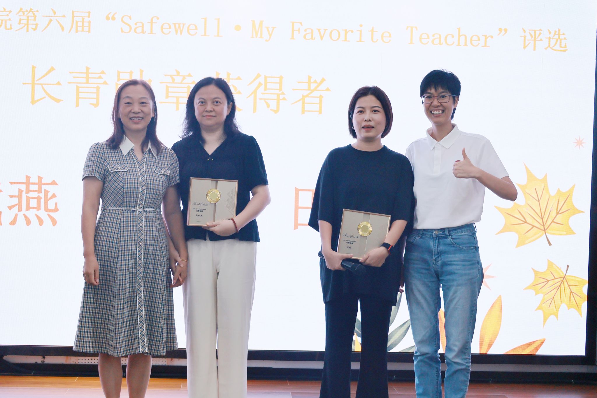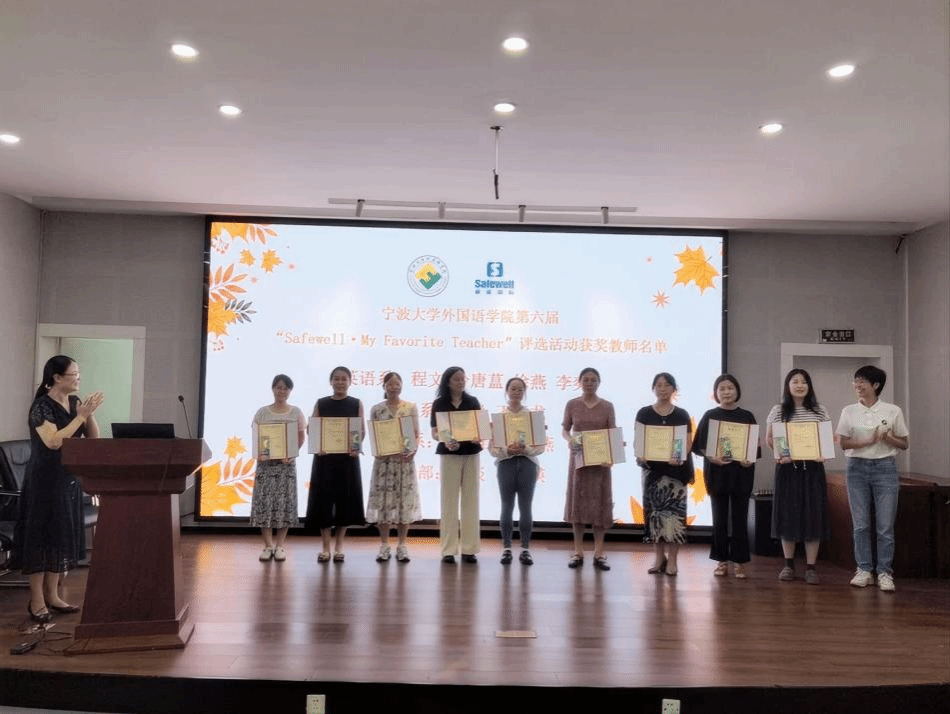 第六届“Safewell•My Favorite Teacher”获奖教师名单。此次评选历经一个多月,在学院党委、纪委和教学督导委员会的共同指导、监督下,全院学生提名投票,经党政联席会审议并公示,10位老师获此殊荣。他们分别是:英语系的程文、冷唐蒀、徐燕和李奕四位老师;日语系的刘静和丁玉龙两位老师;德语系的郭璐君和蔡玳燕两位老师;大学外语教学部的田琰和杨杰瑛两位老师。这十位老师凭借出色的教学能力与独特的个人魅力,赢得学生喜爱,脱颖而出。他们不仅是学术上的导师,更是学生成长道路上的引路人与知心朋友。在全场热烈的掌声中,“Safewell•My Favorite Teacher”奖教金设立者,德语系2011届校友、盛威卓越国际贸易有限公司总经理叶凌玲为十位获奖教师颁发证书,表彰他们在教学一线岗位上的辛勤耕耘与卓越贡献。学生代表为获奖教师献上花束并向每位老师赠送了写满学生感恩留言的卡片。获奖老师逐一发表了自己的获奖感言。他们言辞恳切、真情流露地表达了自己对教师这份崇高职业的由衷热爱和对学生的感激之情。每一个老师的发言都深深打动着在场的听众,现场持续而热烈的掌声是对老师们付出与奉献的最好回应,也是对他们未来继续坚守教育岗位、培育更多人才的鼓励与期许。
