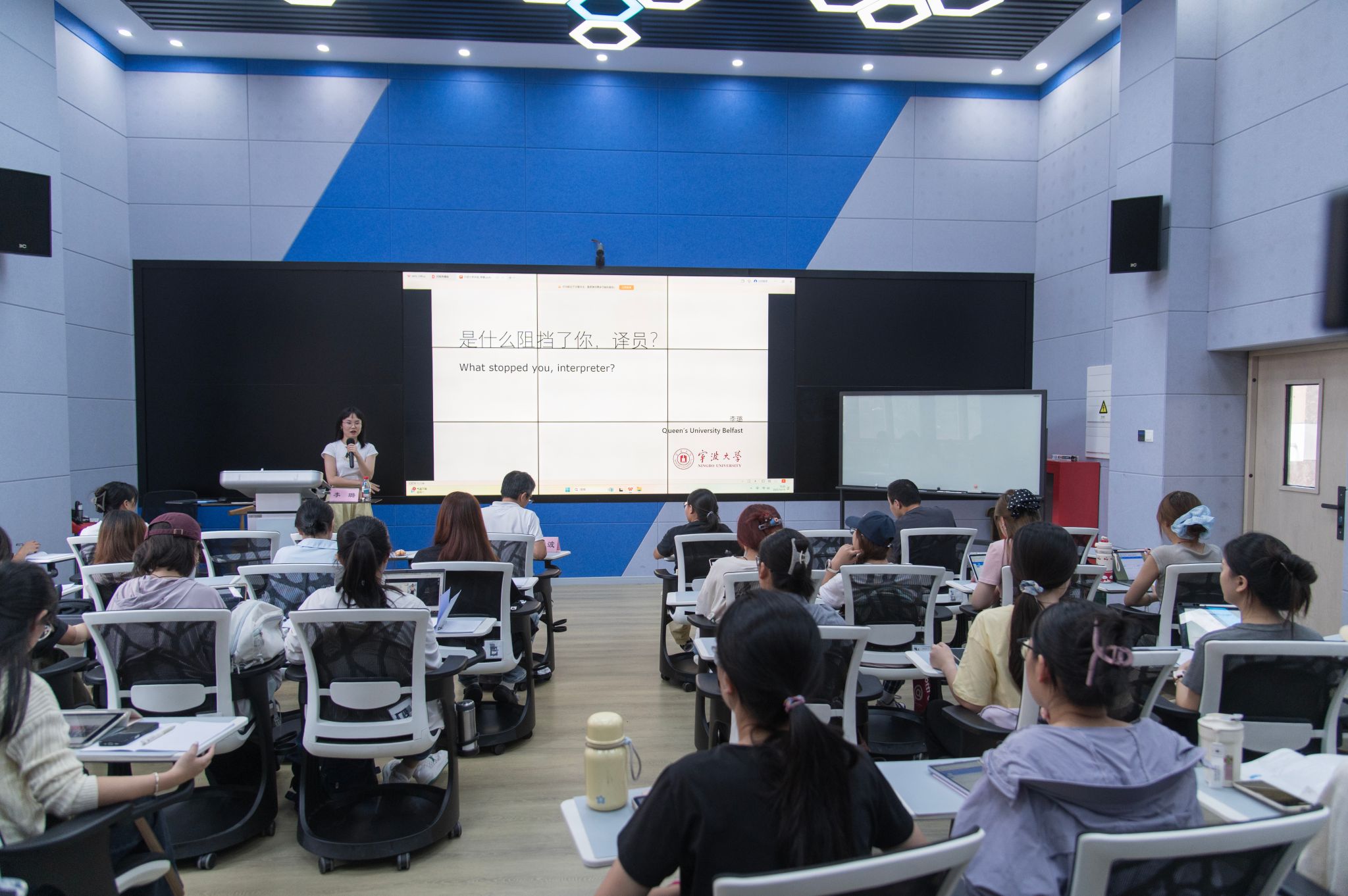“走近职业翻译”系列讲座特邀英国女王大学口译学博士李璐,以“What Stopped You,Interpreter?”为题做精彩分享。李璐博士拥有七年以上国际会议口笔译经验,曾深度参与第七届世界军人运动会、亚欧互联互通产业对话会等重大国际活动,具备丰富的实战经验与科研背景。