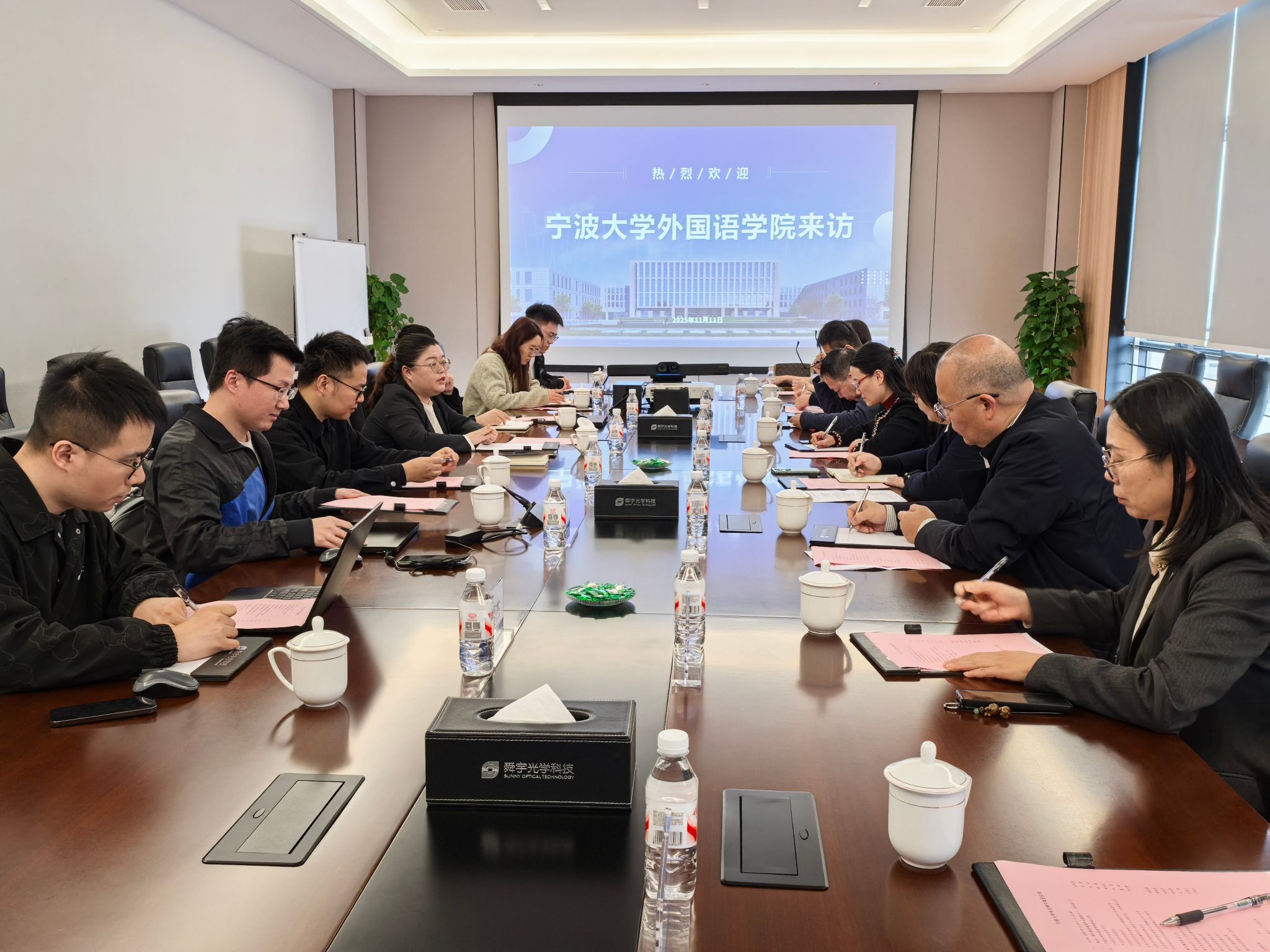 党政领导班子主要成员、语言智能与产教融合中心、翻译硕士教育中心、各院系负责人等一行8人赴舜宇集团余姚总部开展合作交流洽谈。舜宇集团相关负责人热情接待了学院一行,双方围绕人才联合培养、实习就业基地建设等核心议题展开深入研讨,达成多项共识,为后续精准对接产业需求、创新人才培养模式奠定坚实基础。