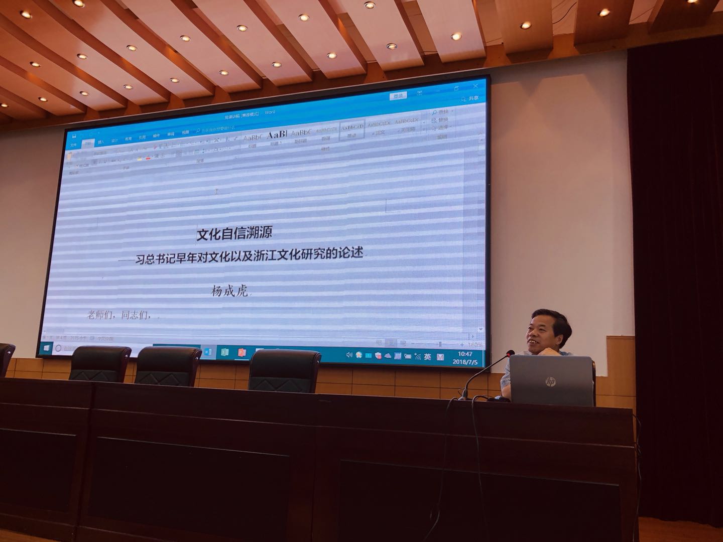 英语系教工党支部书记杨成虎老师在外语楼218报告厅为全院教职工上党课,题目是《文化自信溯源——习总书记早年对文化以及浙江文化研究的论述》。