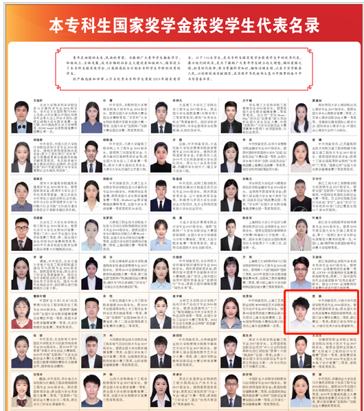 袁帆同学入选国家奖学金优秀学生代表名录,全国共110名,浙江省共4名。《人民日报》对此次入选国家奖学金优秀学生代表名录的学生事迹进行专版刊登。