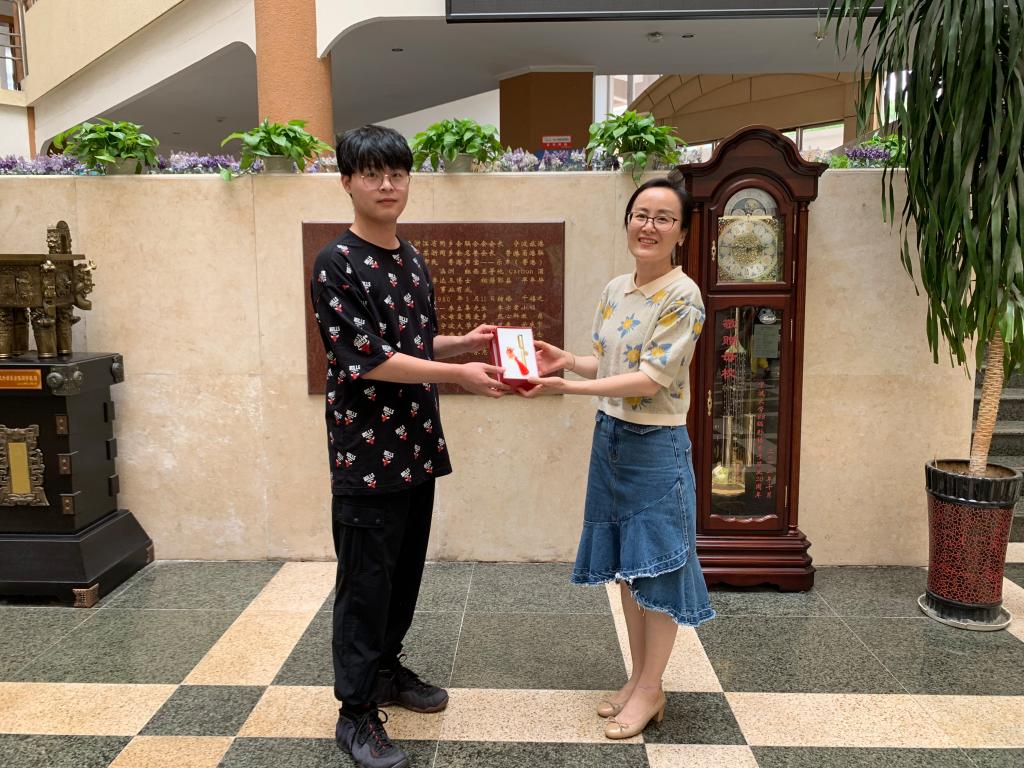相关负责人代表学院向此前捐赠了15000只一次性医用口罩的2019级英语C班的何亦凡同学颁发了捐赠纪念证书和纪念品,并表达了学院师生对他的感谢。