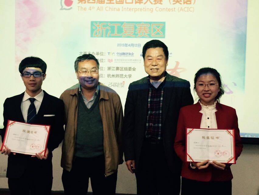 第四届中译杯全国口译大赛浙江省复赛4月12日在杭州师范大学仓前校区举行。来自浙江省各大高校和高职院校94名选手同台竞技,展开激烈竞争,啪啪啦 沈佳伟同学表现突出,力挫群雄,获得冠军。沈同学将代表浙江省参加该项赛事的华东区赛。另外啪啪啦 钱玲丽同学获得三等奖。