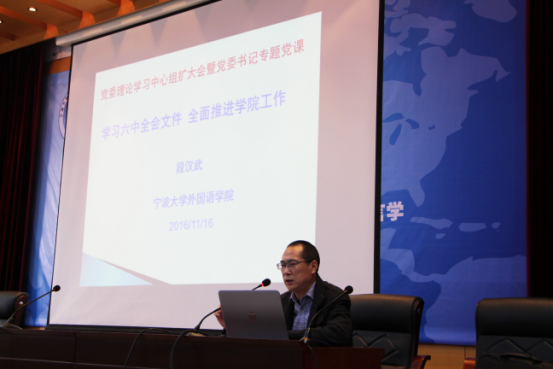 党委在李达三外语楼218报告厅召开全院师生党员党课,专题学习《关于新形势下党内政治生活的若干准则》和《中国共产党党内监督条例》。党委书记段汉武做主题讲座,全院210余名师生党员参加。