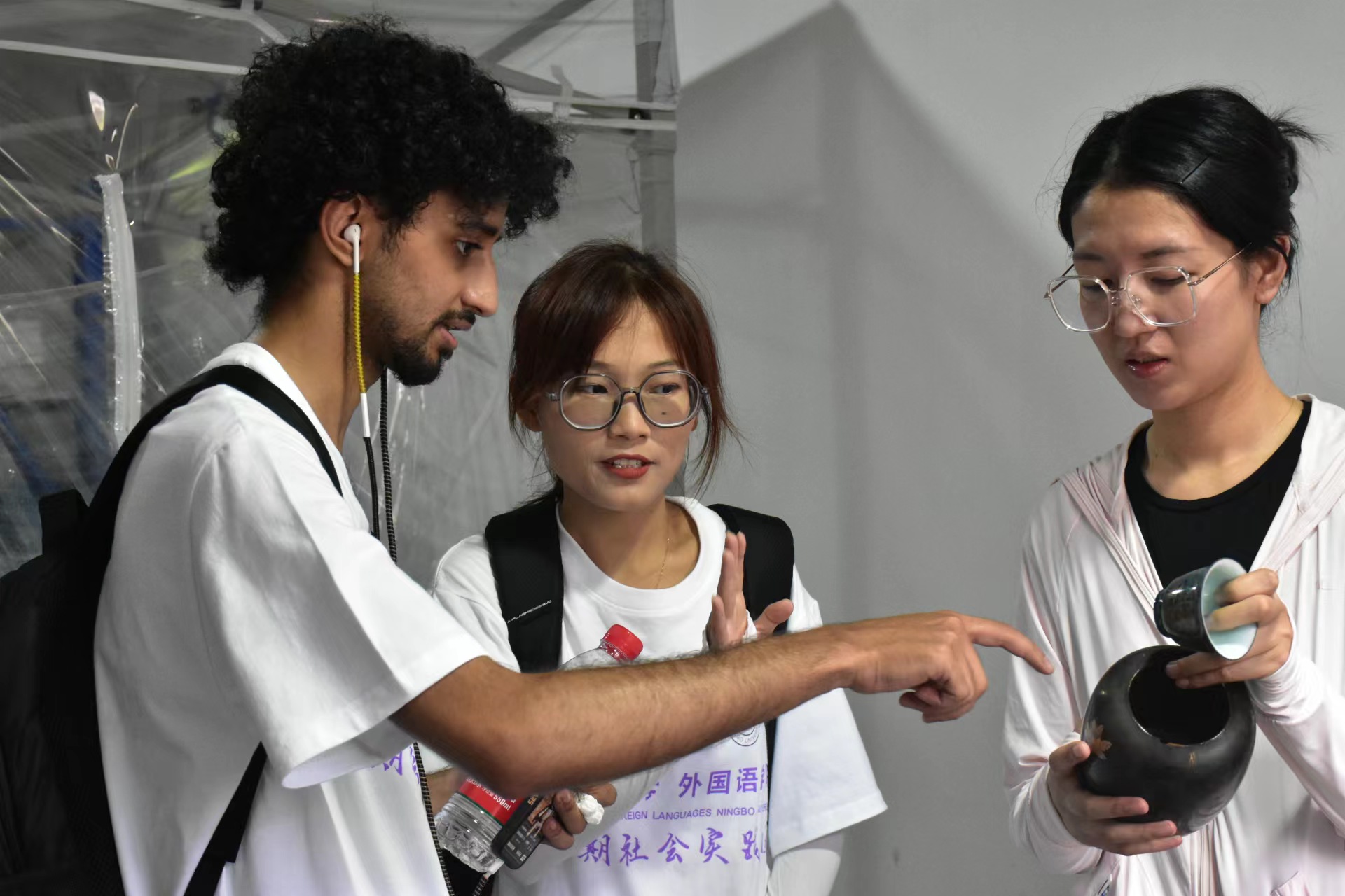 在天通老街的海丝寻迹文化馆,中外大学生进一步了解了海上丝绸之路的发展历史和宁波在建筑文化、茶文化、陶瓷文化等方面与东南亚国家的交流。其中“无钉之殿”所体现的古代传统建筑智慧——榫卯结构,给团队成员们和留学生们留下了深刻印象。巴布亚新几内亚的留学生Monica参观结束后说道:“The Maritime Silk Road-it was a road that had been used like before the Ming Dynasty, and it has been used purposely for trade. It's important that the Maritime Silk Road has been preserved as a remnant of the past to remember. I like it's been preserved, and it's still there as a place people can go and visit.” (海上丝绸之路在明朝以前就开始使用了,对贸易往来很重要。而且重要的是,海丝遗迹被保存下来,我喜欢它被保存下来,它仍然在那里作为一个人们可以去寻迹的地方。)
