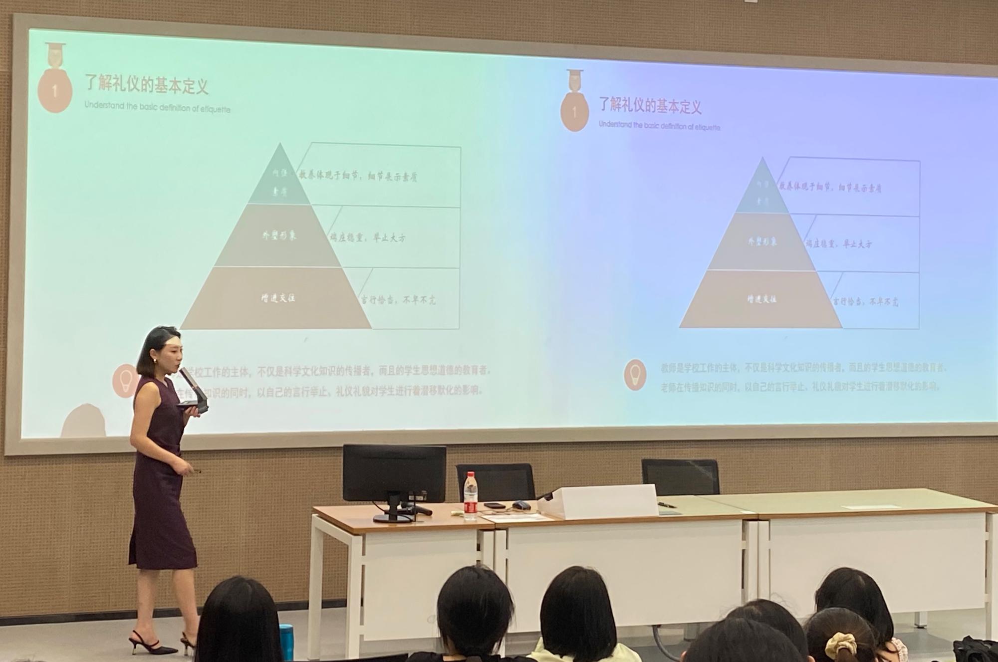 师范生成长系列讲座——“知礼为道 有仪为师”在本部阶三教室举行。国家认证形象管理师、高级礼仪培训师、优雅仪态导师夏天为2019级和2020级英语(师范)专业同学开设了主题讲座,并进行职前教师仪态训练。