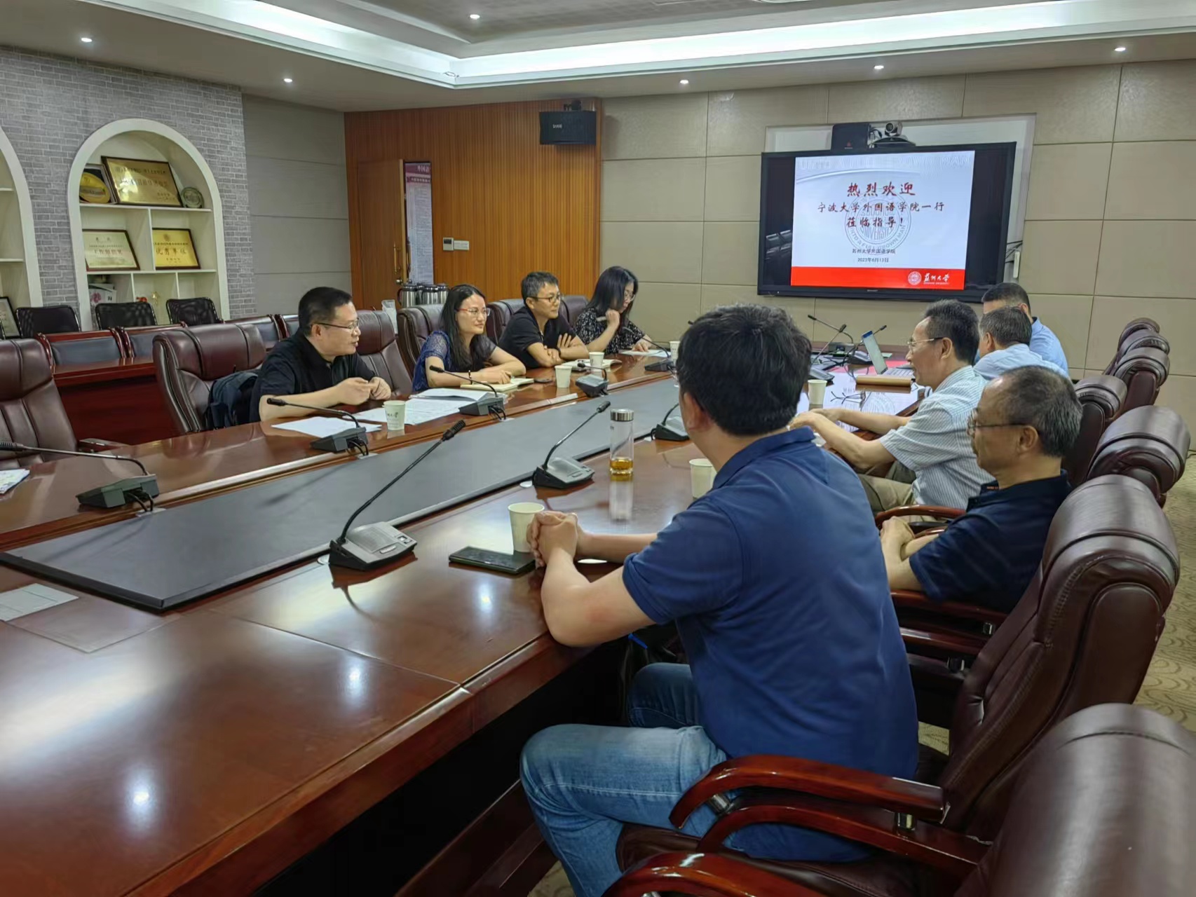 党委书记严冬生、院长朱新福、副院长王军、孟祥春和陆洵参加了座谈会。在座谈中,严冬生和朱新福介绍了苏州大学及苏大啪啪啦