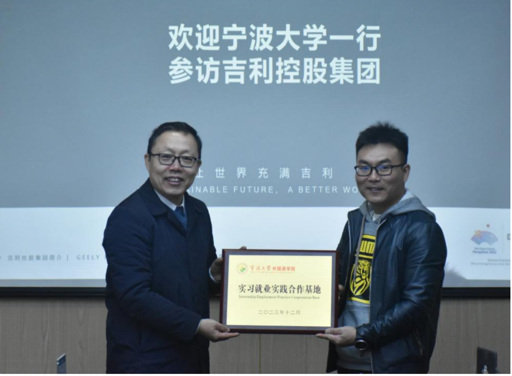 在吉利会议室,副院长张陟与吉利控股集团负责人就建立实习就业实践基地进行签约授牌,并达成校企合作项目,希冀在线上和线下(学校和企业)多渠道开展校企合作,为外院学子与企业员工提供更多更优质的学习平台。随后,企业代表向学院师生介绍了公司历史、经营理念、产业布局等,帮助师生全面了解企业的发展历程和文化理念。副院长张陟提到,宁大与吉利有着相似的历史和成长阶段,在不同的成长历程中共同进步,并且深切表达了对公司培养理念的认同,对外语学子进入如此优秀的企业实习寄予了殷切希望,同时也鼓励同学们不断提升自己,努力向吉利这样优秀的企业靠拢。聂剑君向同学们介绍到公司的经营理念是成为具有全球竞争力和影响力的智能电动出行和科技服务公司。在这一理念和目标的引领下,公司形成了“求真务实、拼搏进取”的核心价值观。同时,他还简要说明了公司承担的主要业务,如吉利乘用车、新能源商用车、智能化、新能源化的技术路线等,并重点介绍了公司各个岗位以及活动,如在杭州第十九届亚运会中,吉利不仅是官方指定用车,公司还负责了清洁燃料的生产,用于亚运会火炬点燃等各大服务。随后,在企业负责人的带领下,师生一行参观了吉利车展,进一步了解企业的主推产品及其特点、销售状况等。