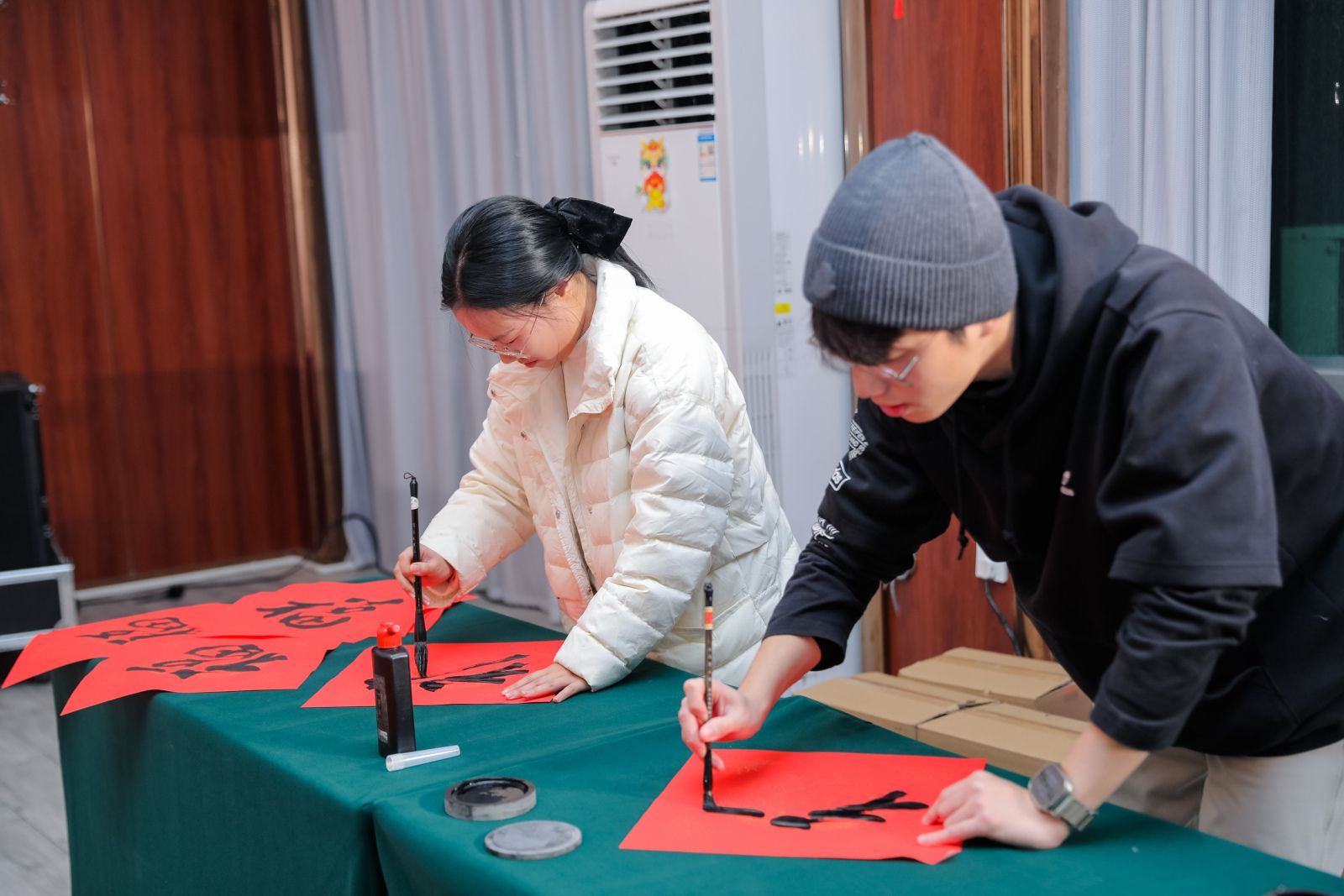 联谊会节目精彩纷呈,学院教师、各届校友带来歌舞、乐器弹唱、瑜伽表演等多种形式的表演,多名校友代表还向自己求学时的恩师敬赠谢师礼,表达了对恩师的想念、感激与真诚的祝福。退休教师杨成虎更为活动作赋,总结2023,愿景2024。研究生施周安健、本科生沈昱辰受邀来到现场挥毫泼墨,书写了百余张福字,吸引了老师们围观欣赏,学院领导们满载深情厚谊,将福字送到每位老师和校友的手中。