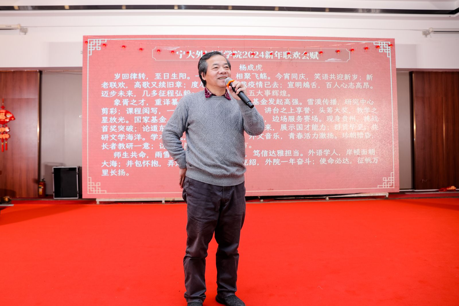 学院特聘院长屠国元致新年贺词,向所有外院前辈、校友和老师们致以新年的问候和祝福。屠院长介绍了2023年学院在学科建设、人才培养、科学研究和学术交流等各方面取得的成绩,向各位前辈和校友表达了真挚的感谢和祝福,并号召全体宁大外院人在新的一年奋发图强,共谋学院高质量内涵式发展。