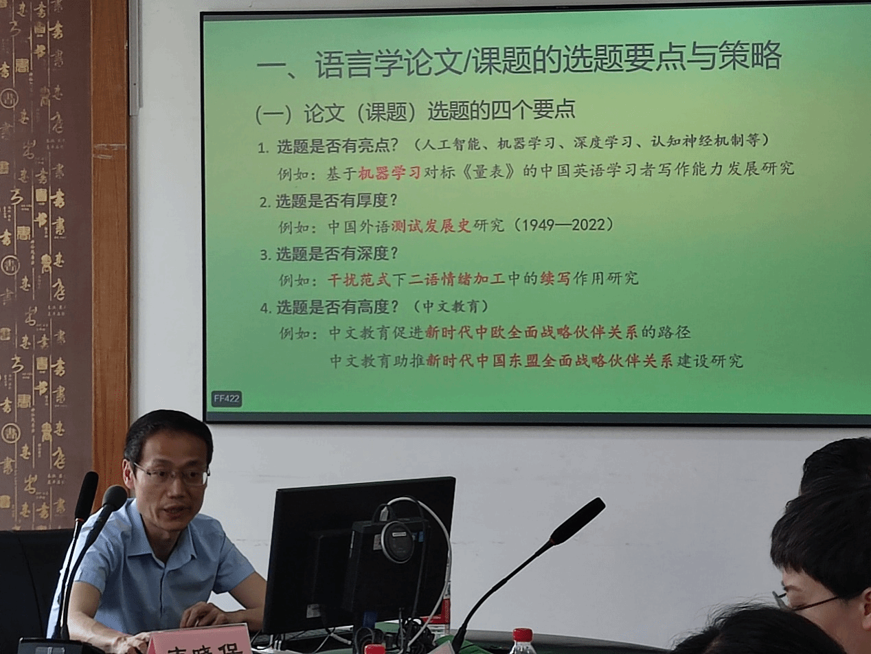 副院长、外国语言研究所所长、认知神经语言学实验室主任韦晓保教授在422会议室以“语言学论文(课题)之选题策略、设计与方法”为题,为啪啪啦