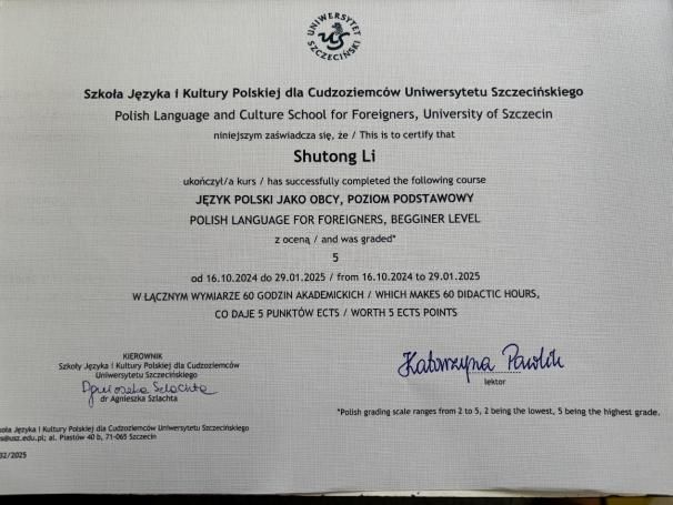 As a German major at Ningbo University, I participated in an exchange program at the University of Szczecin in Poland during the winter semester of 2024-2025. My choice of Poland was driven not only by my interest in the interplay of Central and Eastern European languages and cultures (German and Polish both belong to the Indo-European language family but are from different branches), but also by a desire to apply the cross-cultural theories learned in class in practice. This four-month journey allowed me to achieve multidimensional breakthroughs in academic understanding, language skills, and cultural inclusivity, especially through systematic learning of Polish and obtaining a course completion certificate, which added milestone significance to this experience.